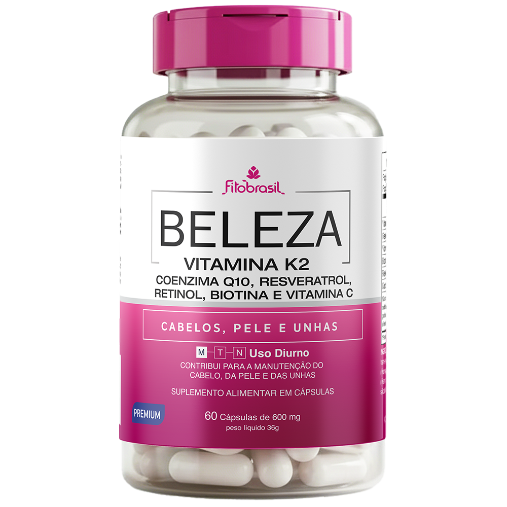 Este suplemento alimentar em cápsulas, denominado Beleza K2, contém uma combinação de vitaminas e nutrientes, incluindo Vitamina K2, Coenzima Q10, Resveratrol, Retinol, Biotina e Vitamina C. É formulado para fornecer benefícios específicos à saúde, especialmente relacionados à beleza e ao bem-estar geral.